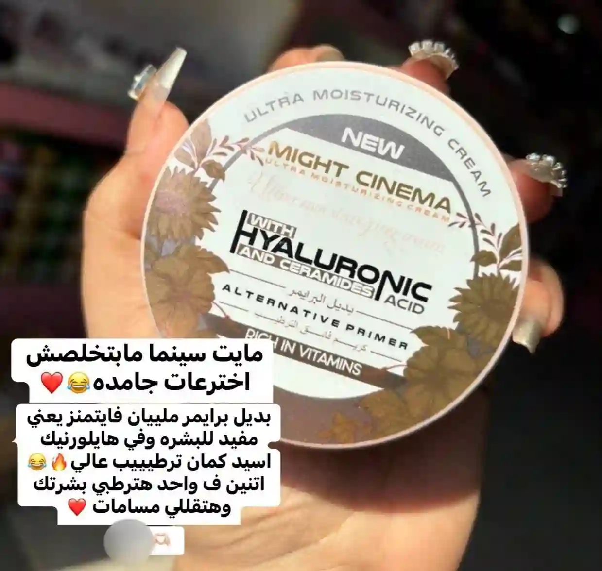كريم مرطب مايت سينما الجباااااااركريم فائق الترطيب وبديل للبرايمر لجميع انواع البشرهافضل مرطب ع الاطلاق لانه غنى بالهيالورنيك اسيد ومناسب لجميع انواع البشرهبيحسن من. افراز الدهون فيها والبشره بتمتصه بسرعه جداااده غير ان فى بعض الميكب ارتيست ببستخدموه بديل البرايمر. قبل الميكب